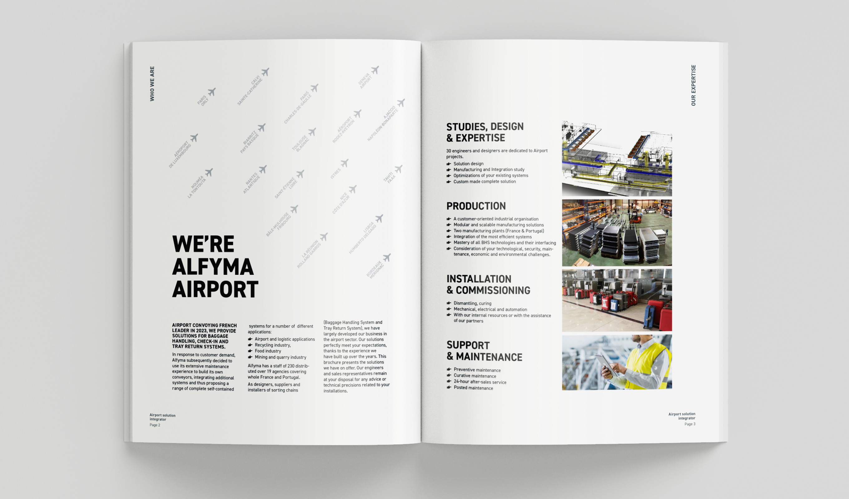 Alfyma est une entreprise spécialisée en systèmes de convoyage dans les secteur de l’aéroportuaire, du recyclage, du BTP, de la logistique et de l’agro-alimentaire. Hormis quelques grands groupes, les entreprises industrielles se contentent souvent d’une image de marque à minima. Alfyma se démarque dès 2005 en adoptant une image de marque réfléchie. En 2012, Gradual est mandatée pour la refonte globale de l’image de marque. Nous accompagnons Alfyma dans la création d’un nouveau logo et d’une charte graphique, des supports de communication (brochures, carte de visite, flocage des véhicules...), d’un site internet et d’habillages de stands de salons. Depuis, c’est un partenariat solide qui s’est créé et nous continuons d’accompagner Alfyma dans sa stratégie de communication sur le long terme.