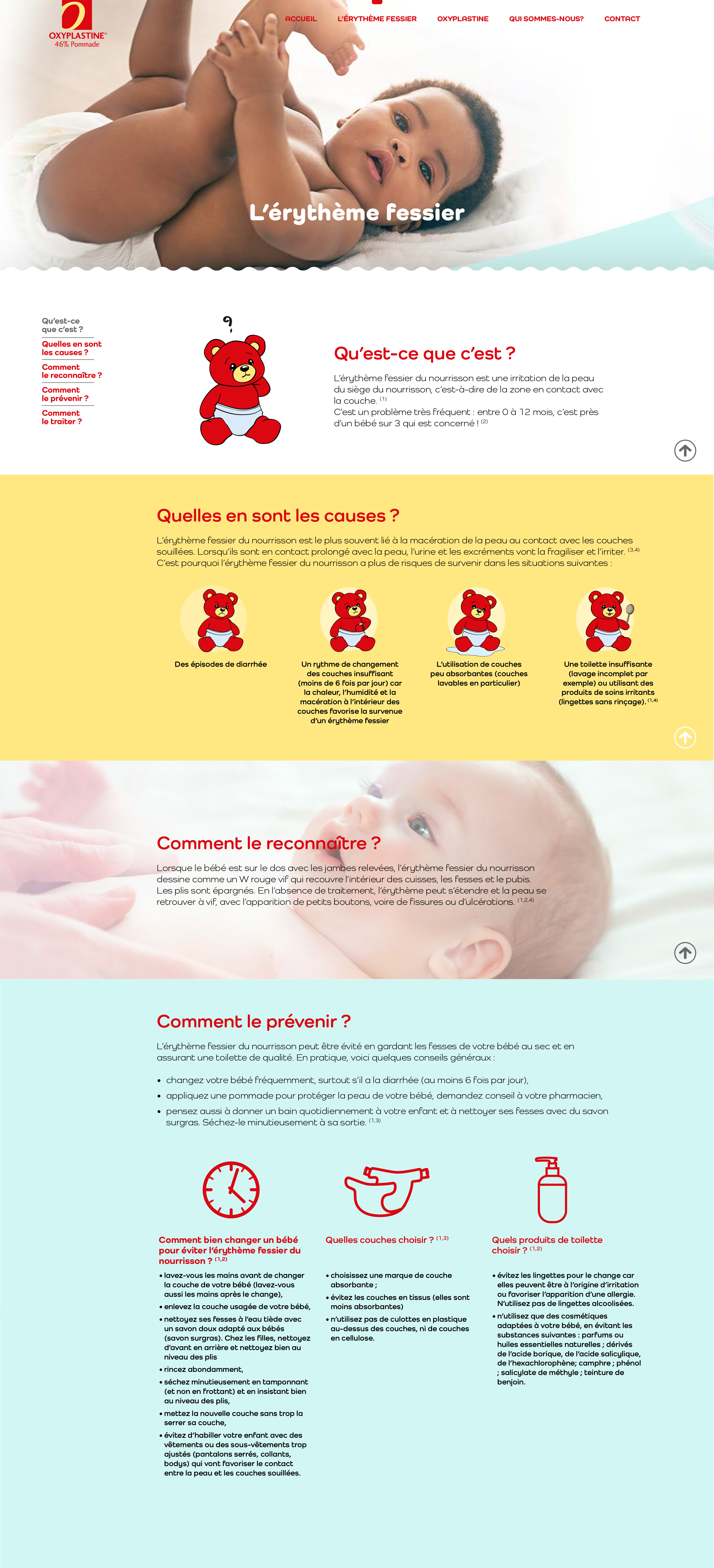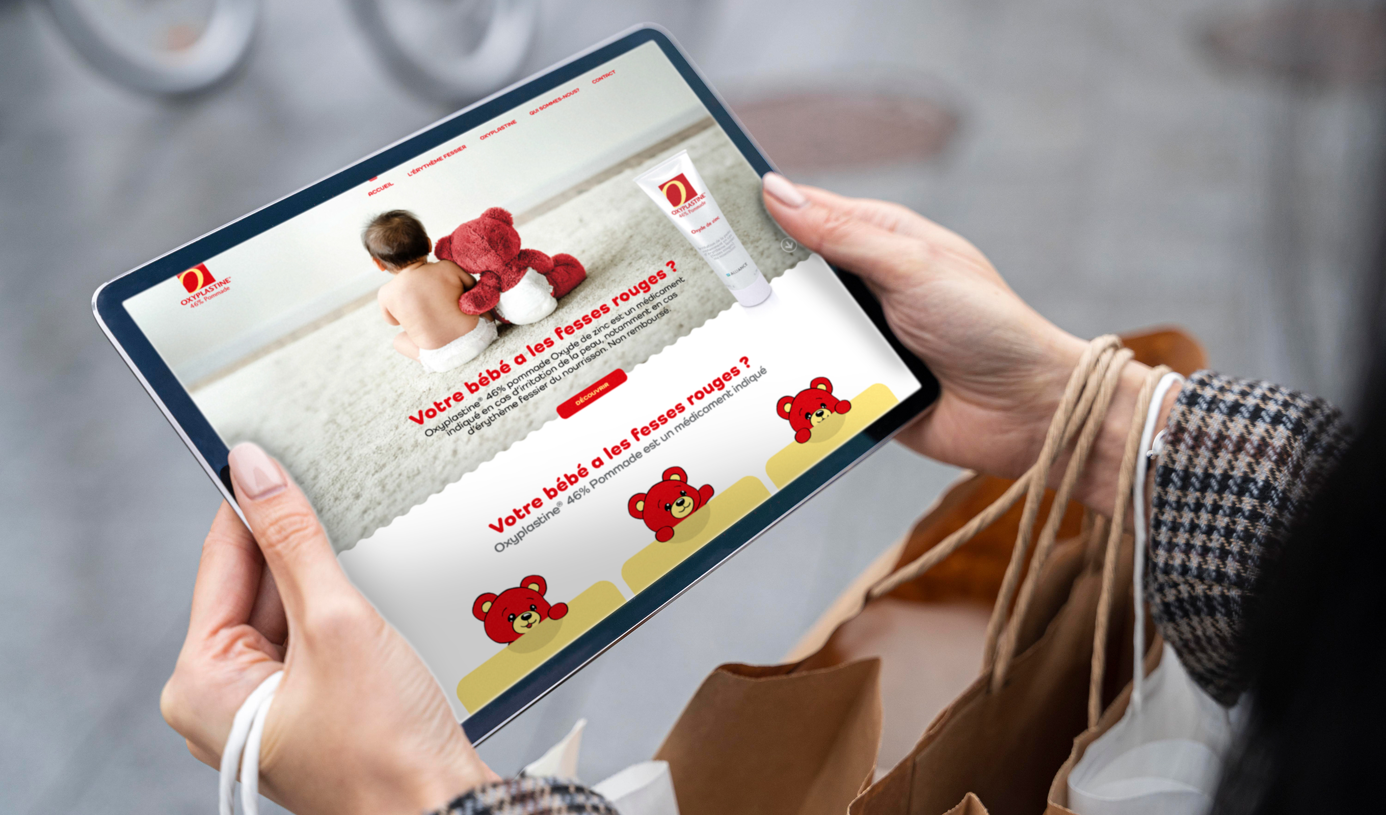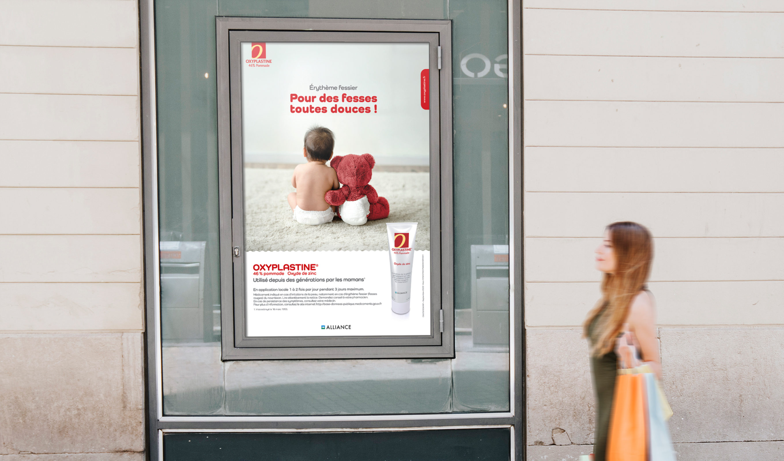 La gamme Oxyplastine d’Alliance Pharma est une crème spécialement conçue pour traiter les érythèmes fessiers des bébés. Pour renforcer la visibilité du produit et moderniser l’image de la marque, nous avons créé une toute nouvelle creative platform au sein d’une charte uniformisée de l’ensemble des produits Alliance Pharma. Cette plateforme se base principalement sur une mascotte, un ourson rouge, symbole de la crème Oxyplastine qui prend délicatement bébé par le dos, illustrant la protection et le réconfort offerts par le produit. Cette mascotte devient ainsi l'élément central de la nouvelle identité visuelle, apportant une touche émotionnelle et rassurante.